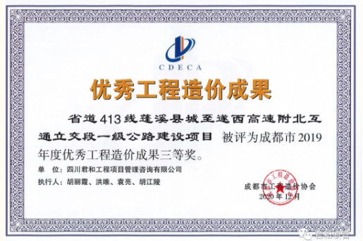 同时,由我司完成的省道413线蓬溪县城至遂西高速附北互通立交段一级公路建设项目和城东新区航向花园棚户区改造建设项目均荣获“招标控制价或工程量清单计价成果”奖